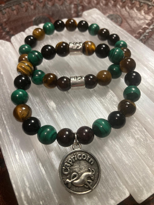 Capricorn Astrology Zodiac Bracelet - December January - Malachite - Tigers eye - Garnet - Obsidian